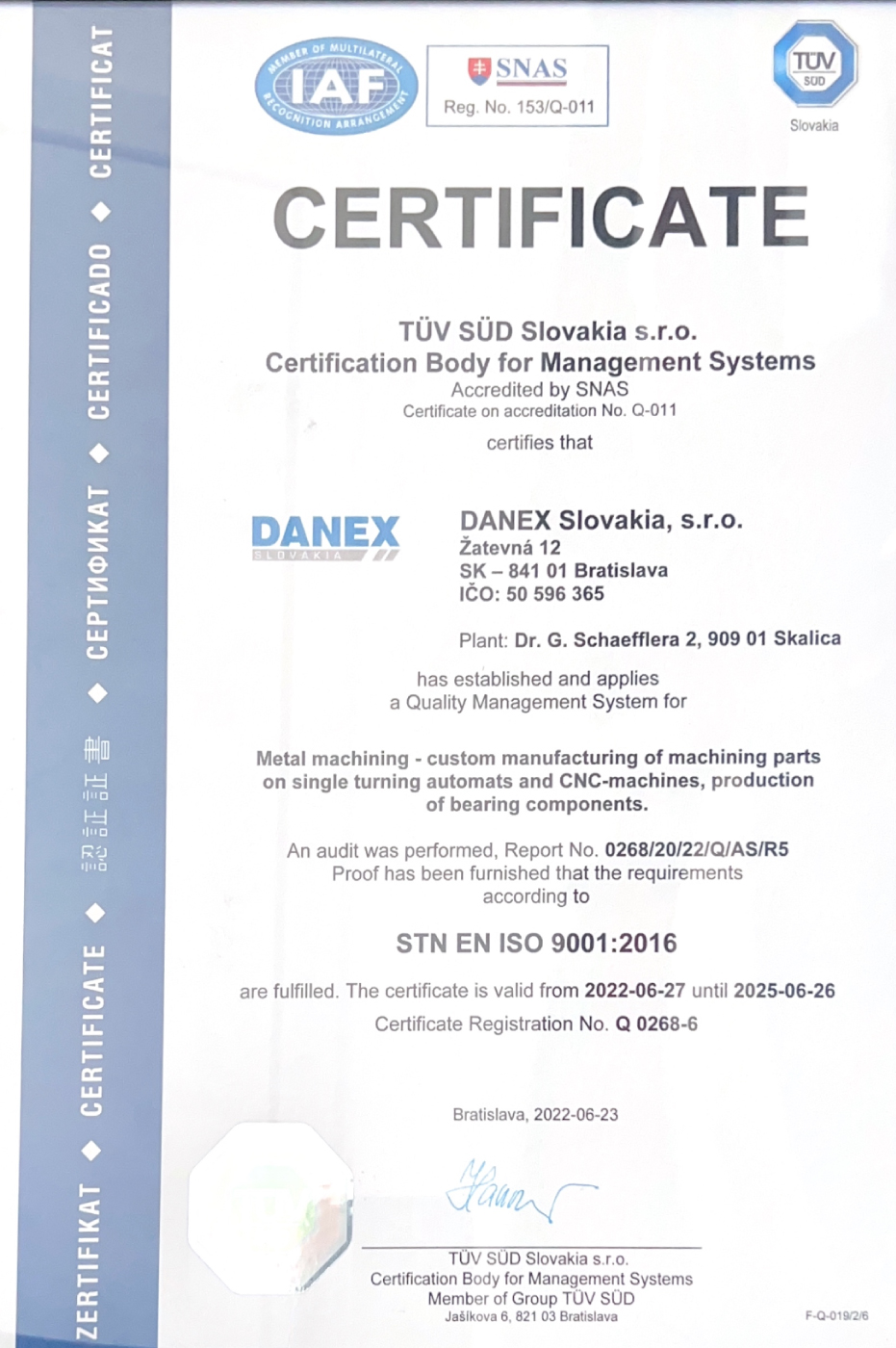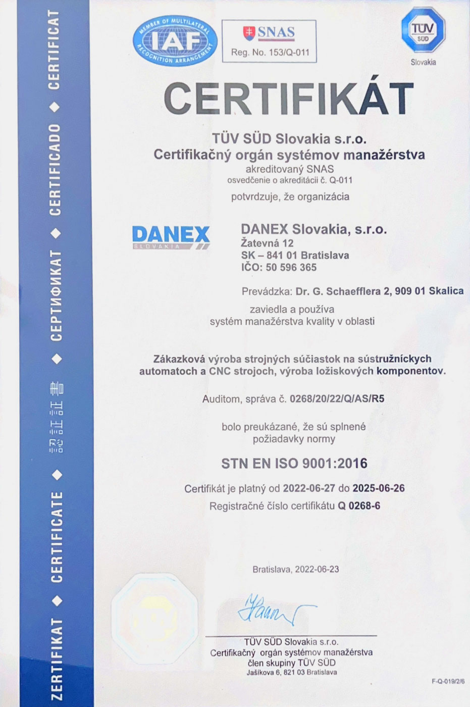 We have an established and certified integrated quality management system ISO 9001:2000 regularly verified by the accredited certification body TÜV SÜD Slovakia.