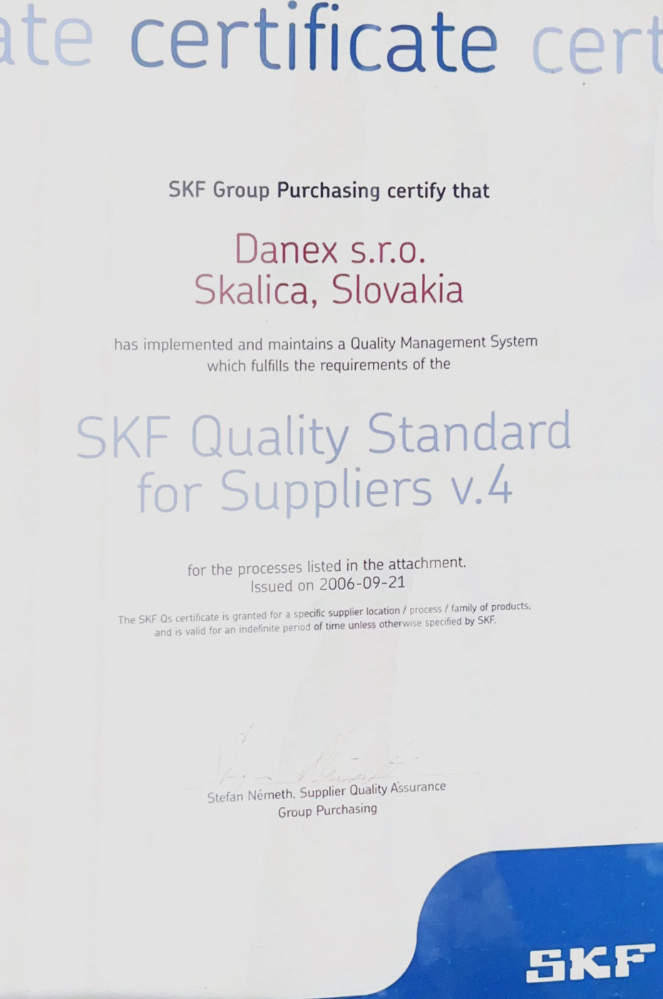 As a company, we have received the SKF Quality Standards for Suppliers v.4 certificate from one of our most important business partners, the SKF Bearing Group.
